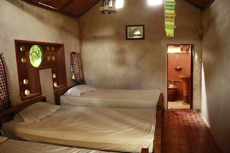 The room is made from earth walls (adobe bricks) and has a private bathroom. The room is cooled by the earth walls, and only an electric fan is enough to feel comfortable. Take the chance to stay in a room made of earth while you study earth building !