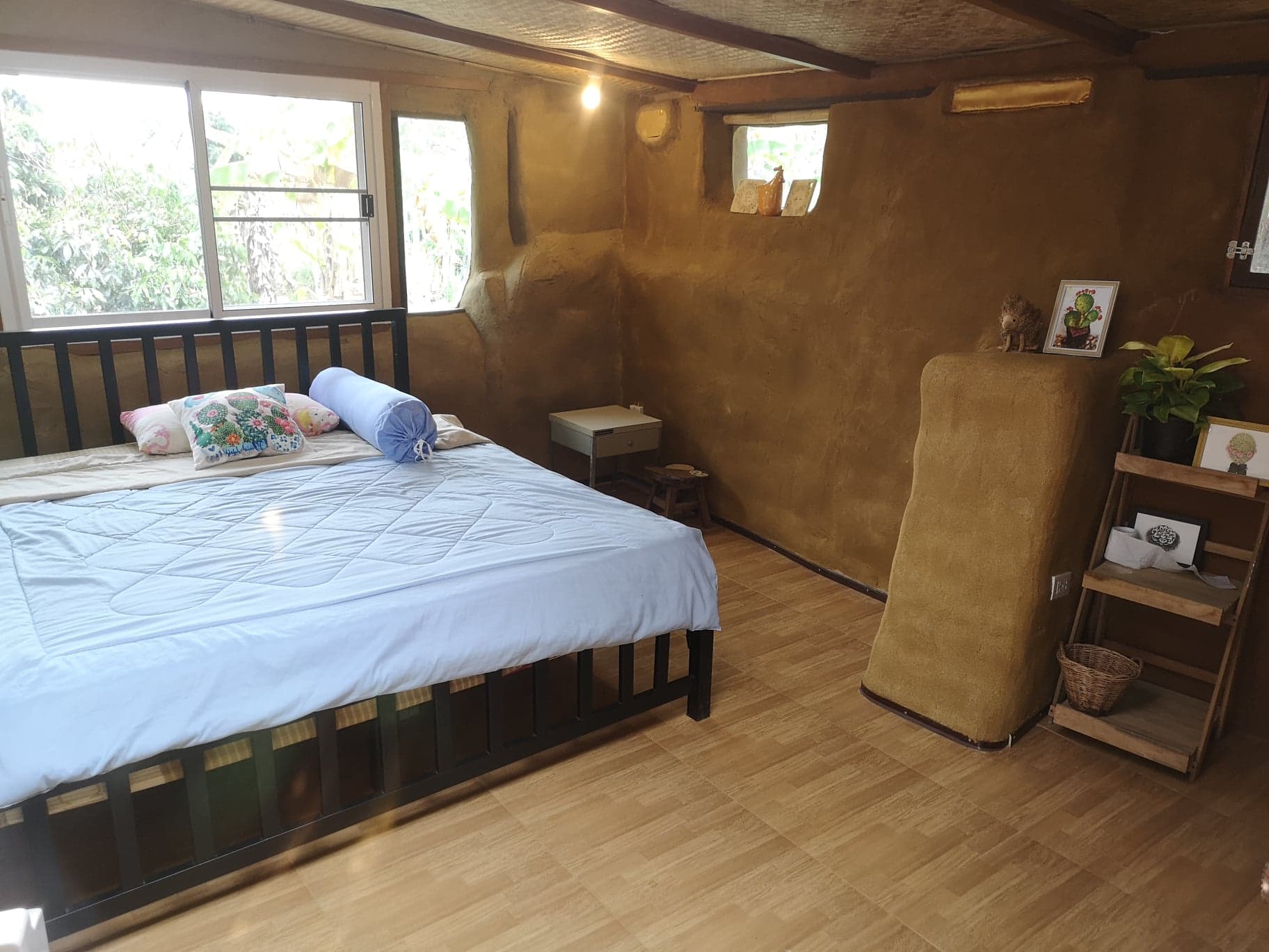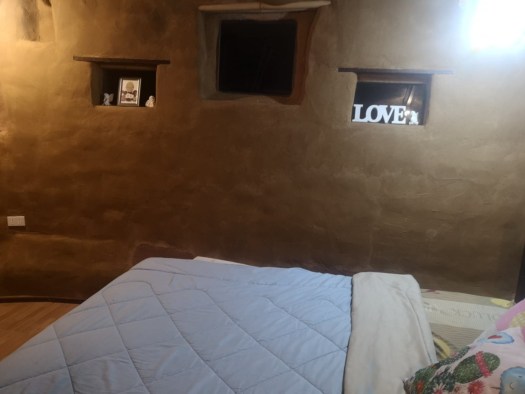 The room is made from earth walls and has a private bathroom. The room is cooled by the earth walls, and only an electric fan is enough to feel comfortable. Take the chance to stay in a room made of earth while you study earth building !