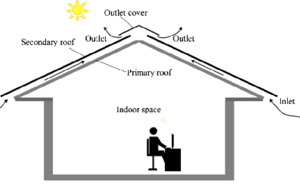 Double-skin roof: An outer roof, made of a bamboo frame and climbing plants, will be installed in 2026 above the metal sheet roof, with a 20 cm gap between the two roofs. The roof system will then be naturally ventilated by natural convection (air flow).