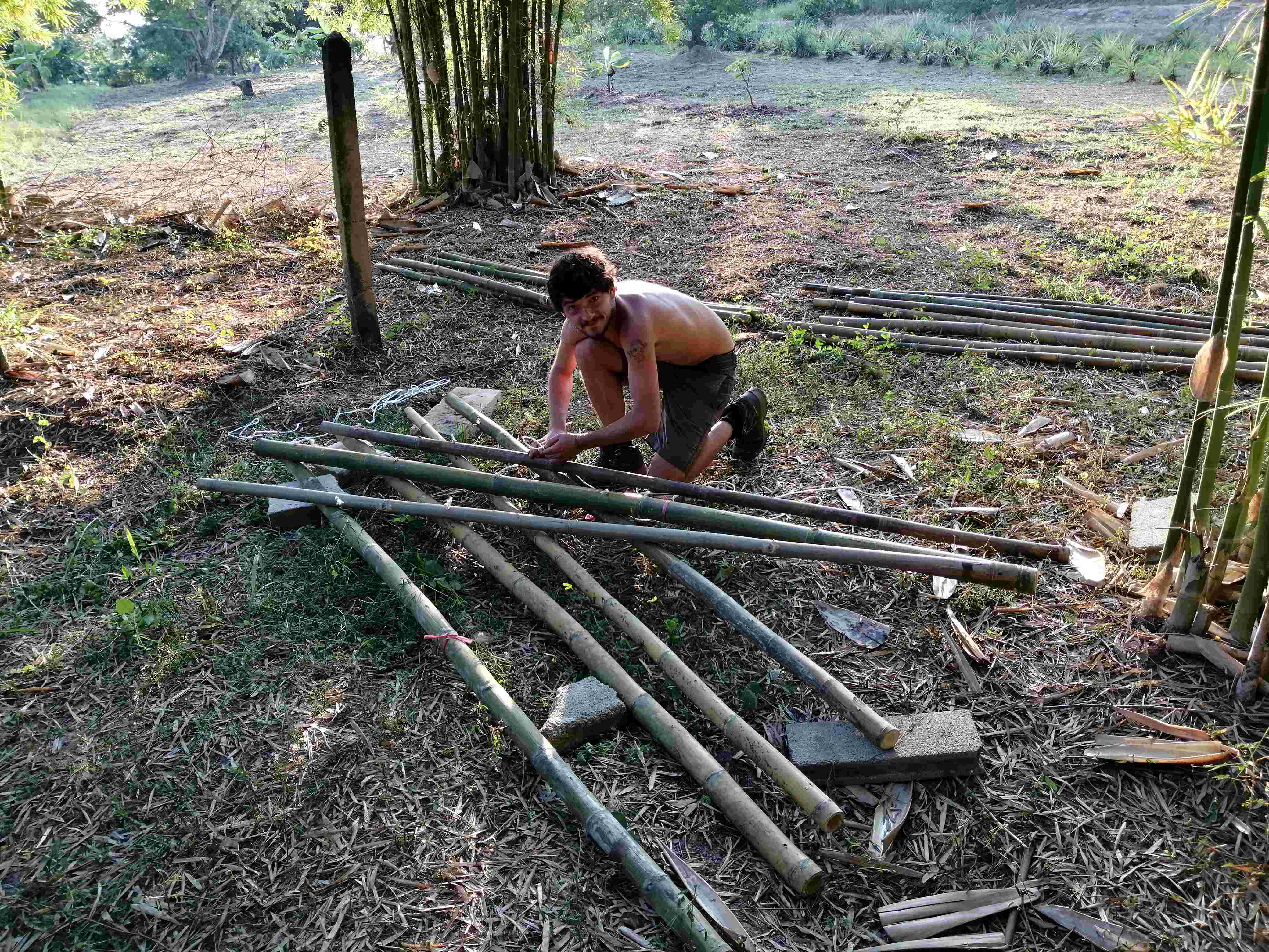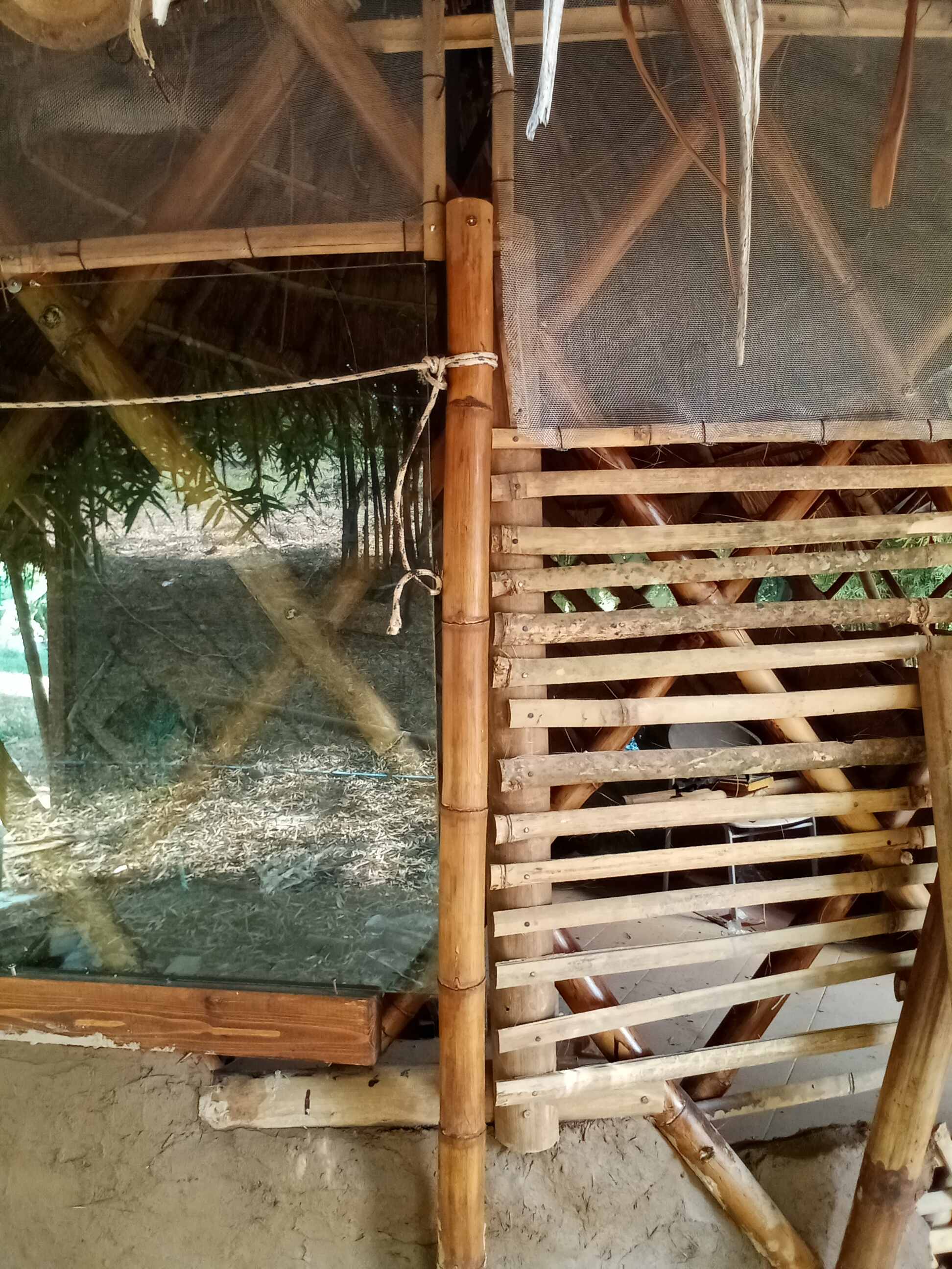 It was installed on a rubble rock foundation to lower expenses and avoid the concrete carbon footprint. Sixty bamboo canes were assembled with strong ropes, treated with non-toxic chemicals (boric acid and borax) to protect them against insects. The roof structure was made of 14 strong treated bamboo poles, and the roof was covered with local thatch, as an insulated and waterproof roof.