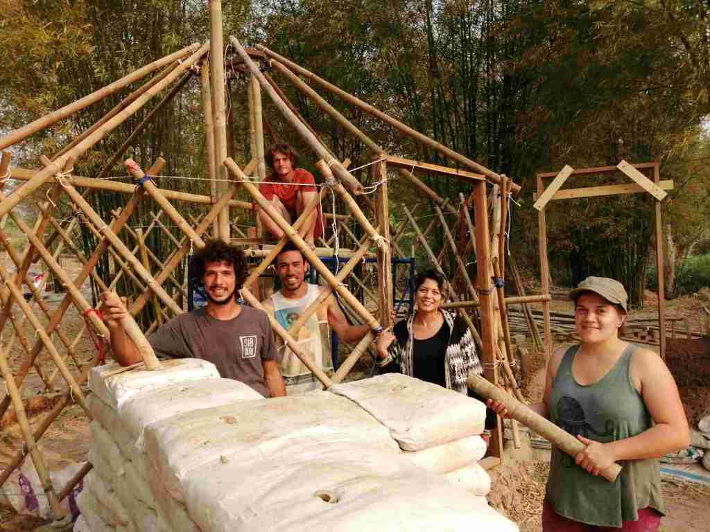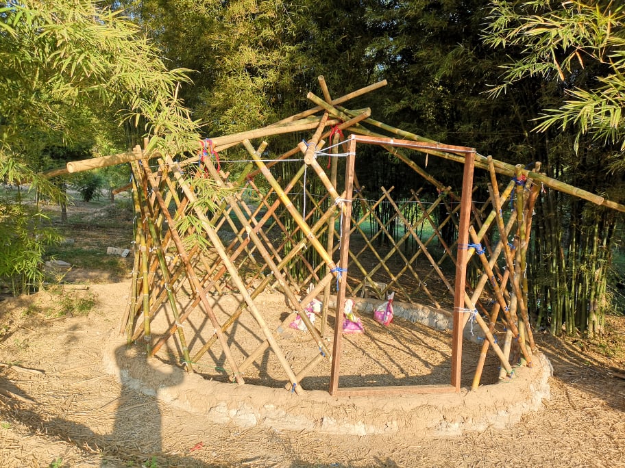 The walls are partially covered with earth using a technique adapted from the ancient ‘wattle-and-daub’ technique. Then an earth mix (earth, sand, and straw) is applied around split bamboo weaved between the yurt canes.