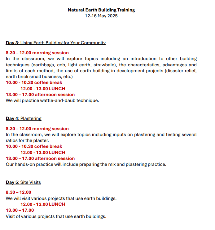 Earth Building Training Schedule Share this: Click to share on X (Opens in new window) X Click to share on Facebook (Opens in new window) Facebook Like Loading...