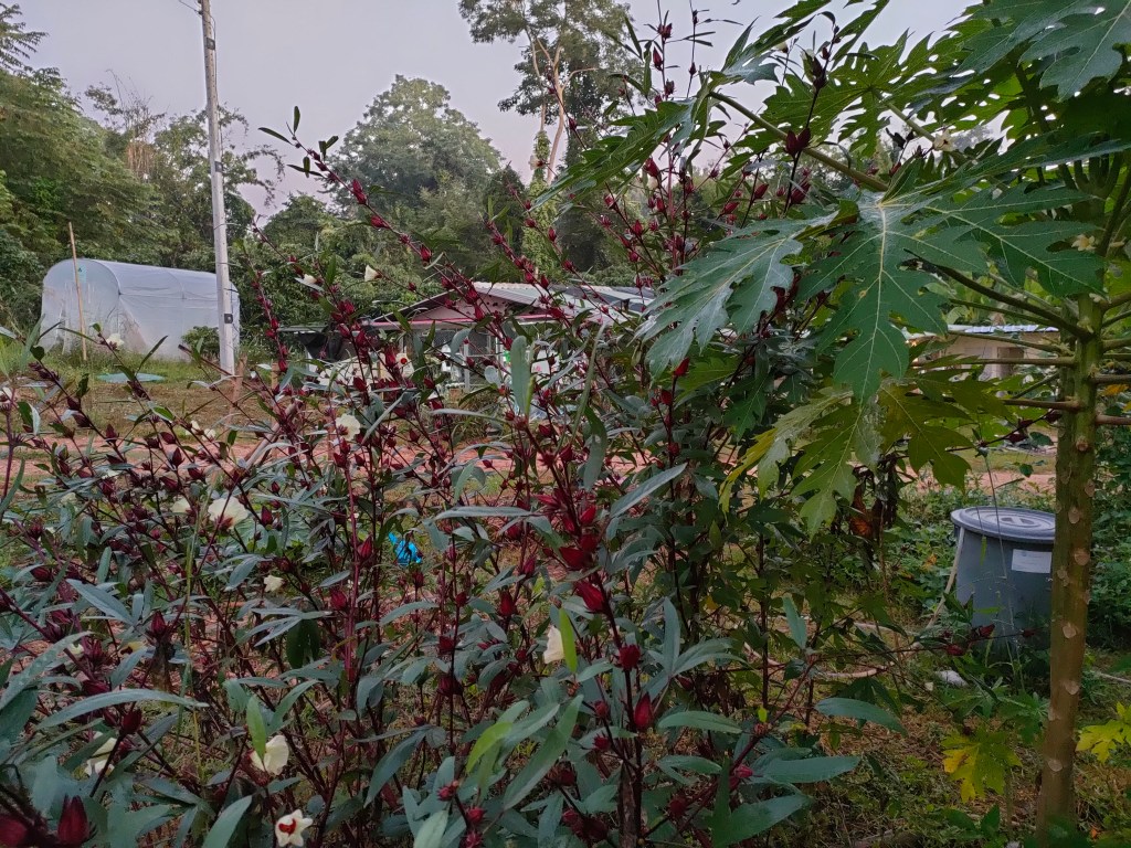 Our garden is now expanding. We are growing organic fruit trees: papaya, avocado, lime, passion fruits, mango, banana and roselle. The garden gives us delicious vegetables: asparagus, beans, chillies, sweet potatoes, cucumbers, corn, salad and several kinds of edible herbs.